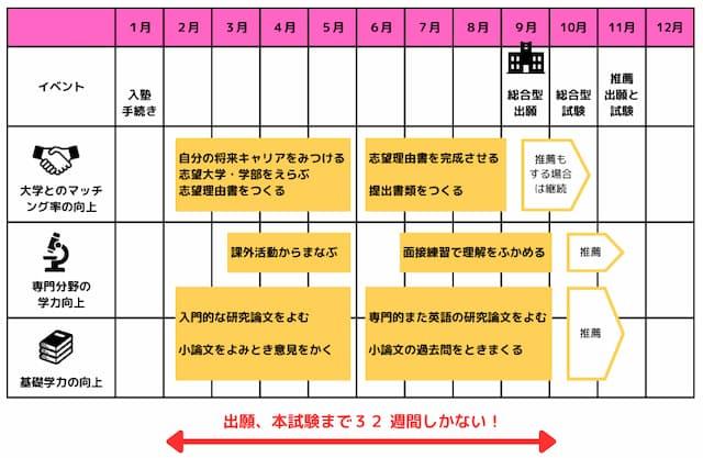 ※ 「えっ?」と思ったかもしれませんが、入塾時期が遅くなった場合は入塾金を高くしております。理由は、遅い入塾だと志望理由書や小論文過去問対策などを急ピッチで仕上げなくてはならず、早く入塾した生徒よりも 1 か月間の指導回数が倍以上多いからです。遅い時期に入塾すると出願できる大学が限られてしまいますし、課外活動に取り組む時間もなくなるため、早い時期の入塾をオススメします